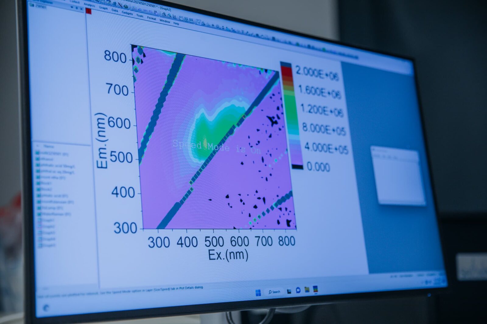 液体の蛍光分析法ではすでに確立している定量分析に向けて課題は多いが、その足がかりとなる定性的なデータの検討を進めているという。